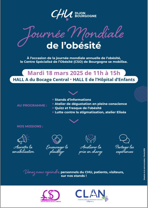 À l’occasion de la Journée mondiale de l’obésité, le Centre Spécialisé de l’Obésité (CSO) et le CLAN (Comité de Liaison Alimentation Nutrition) du CHU Dijon Bourgogne se mobilisent pour sensibiliser, informer et échanger autour de cette thématique de santé publique majeure.