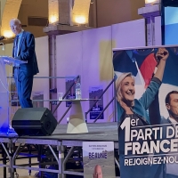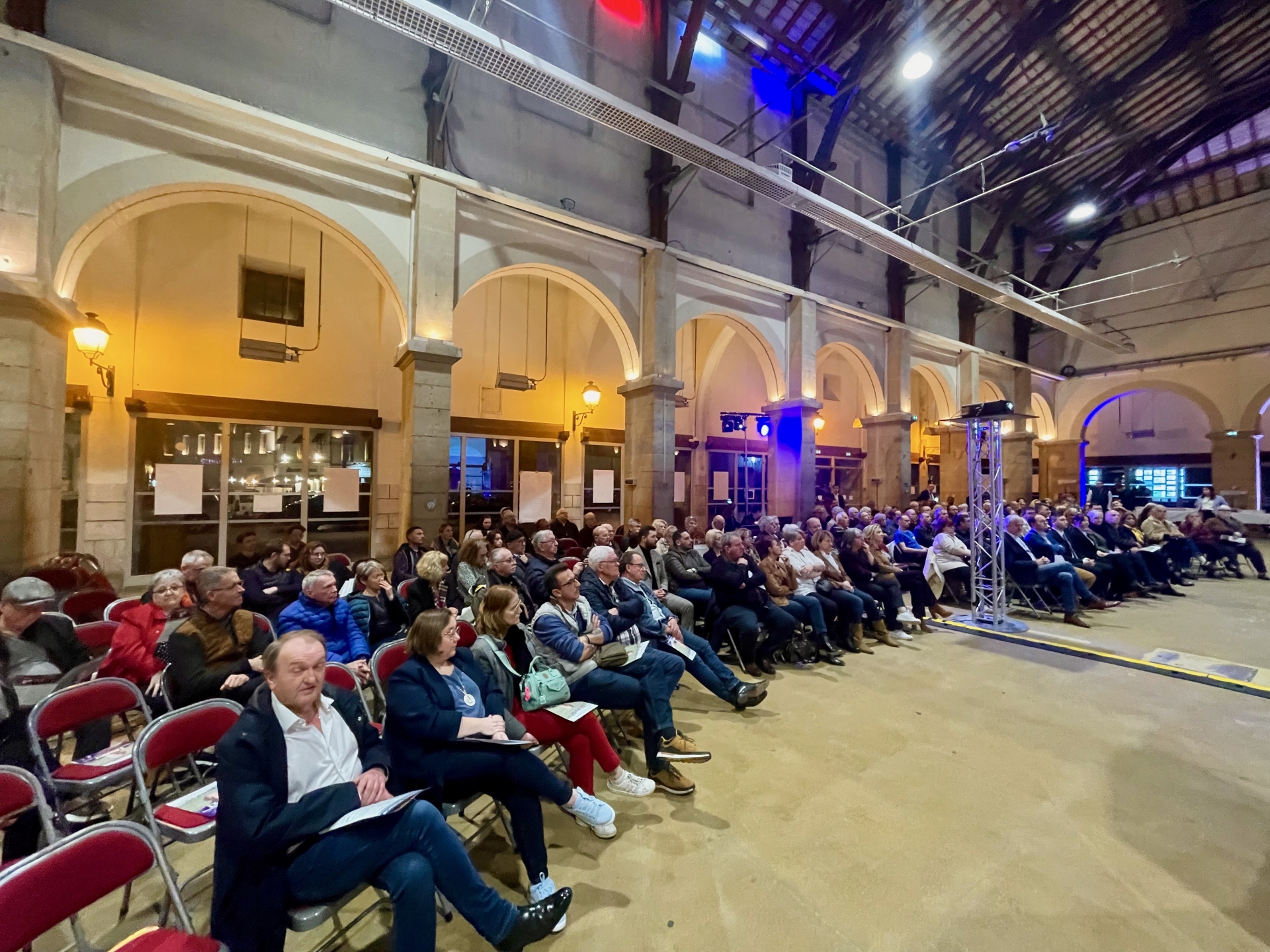 C’est au cœur du centre-ville, sous les Halles, que le candidat soutenu par le Rassemblement National avait choisi de donner son unique rendez-vous public de campagne, la stratégie privilégiée par le candidat ayant surtout reposé sur le tractage sur le marché et la distribution de documents dans les boîtes aux lettres. Au pied de l’estrade, éclairée de lumières bleu, blanc et rouge, un kakemono représentant Marine Le Pen et Jordan Bardella rappelait l’ancrage politique de la liste. À l’entrée et sur les côtés, un service d’ordre veillait au bon déroulement de la soirée.