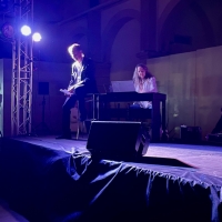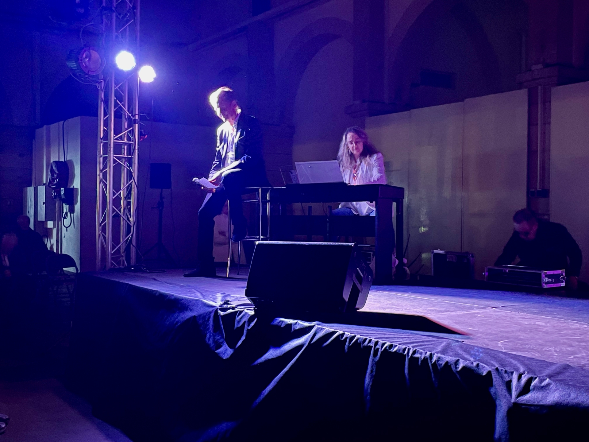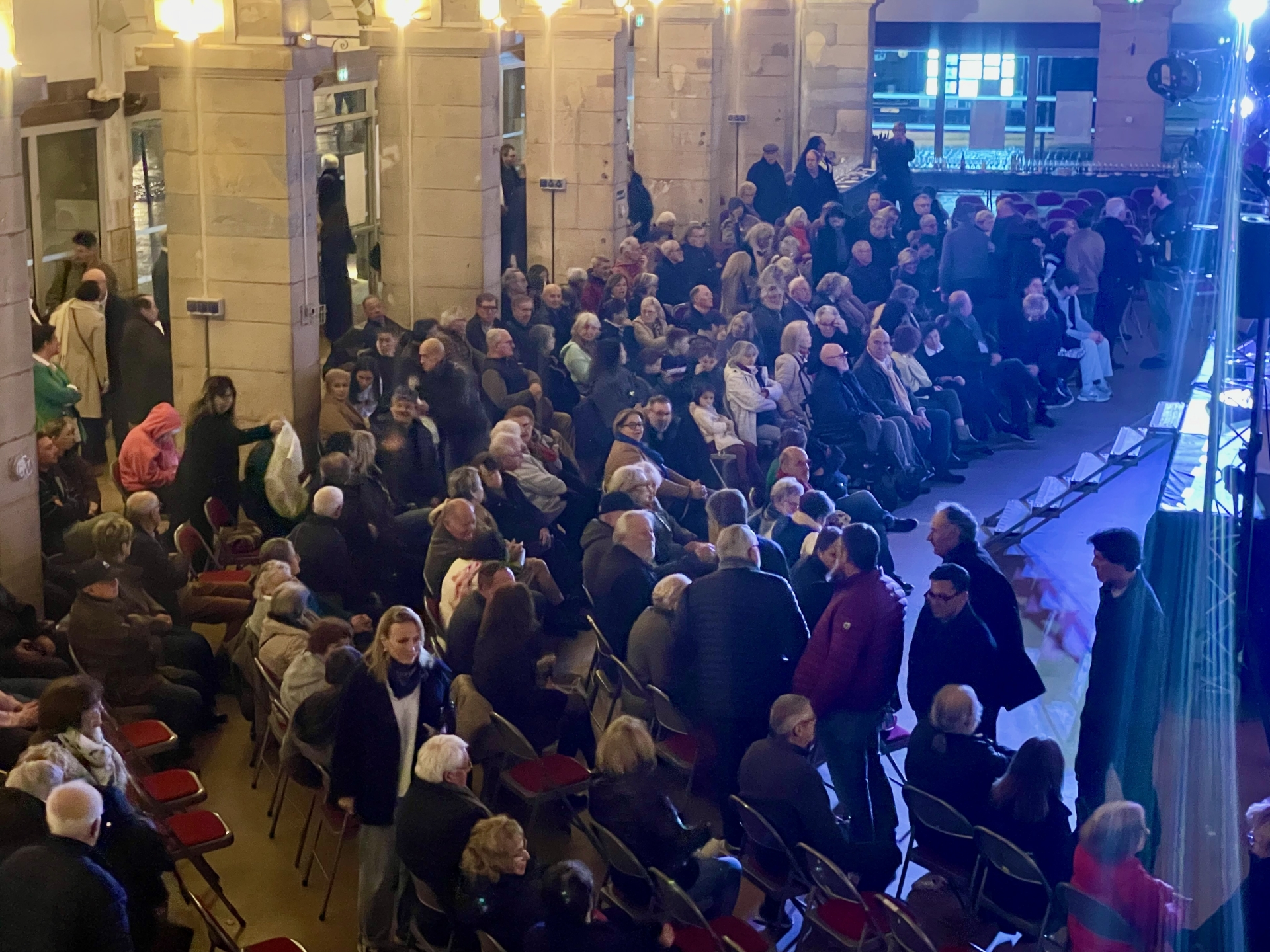 Lorsque le maire sortant est apparu, la salle était plongée dans le noir. Assis sur une chaise haute, lumière tamisée éclairé par deux projecteurs, il était accompagné au piano par Yolande Kouznetsov, pianiste concertiste beaunoise également candidate sur sa liste. Une entrée presque théâtrale, évoquant l’atmosphère d’un crooner sur scène.