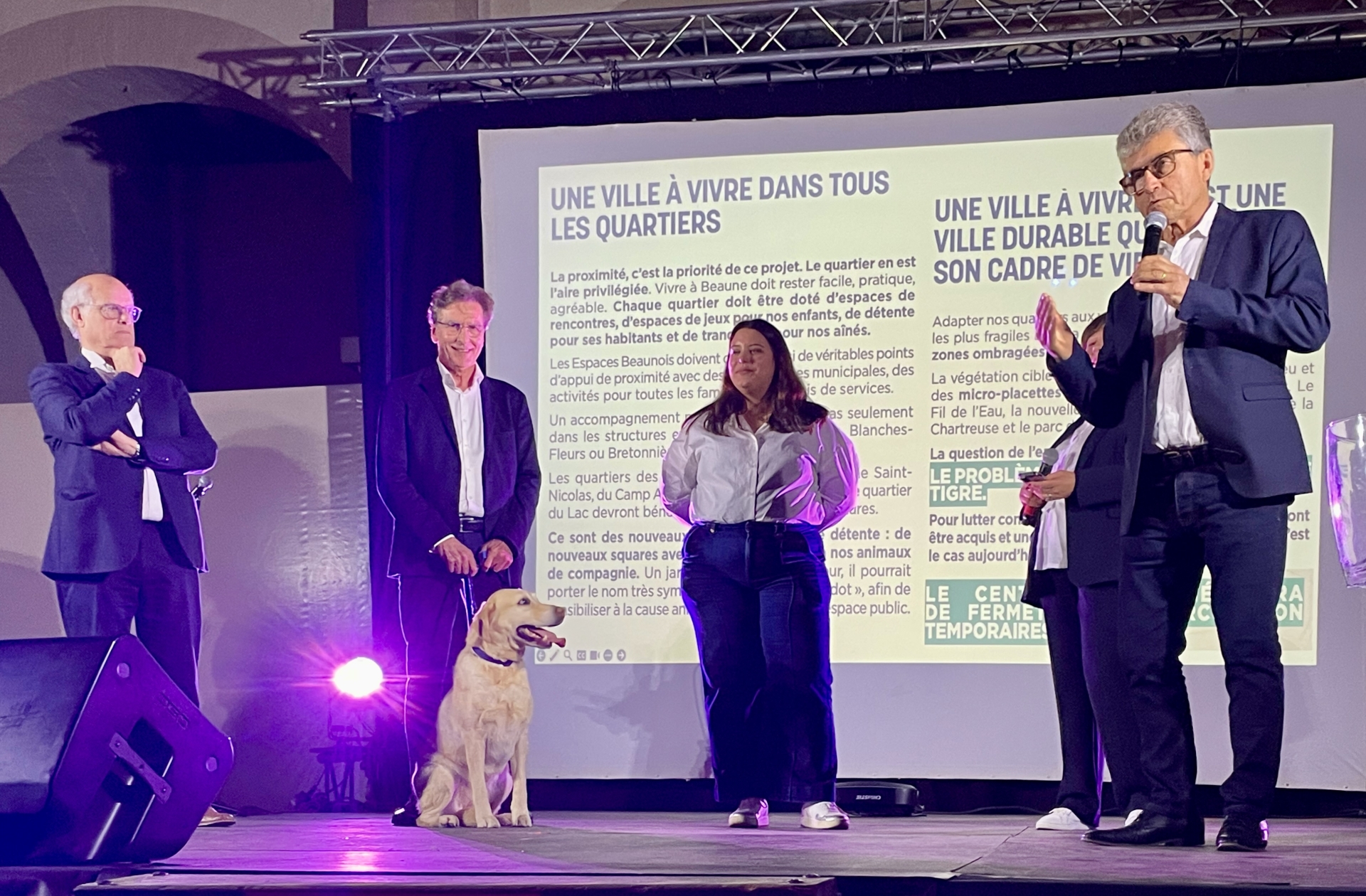 Le thème du bien-être animal a été incarné par Jean‑Jacques Bynen, vétérinaire retraité et colistier, qui est même monté sur scène accompagné de son labrador Ortigue.