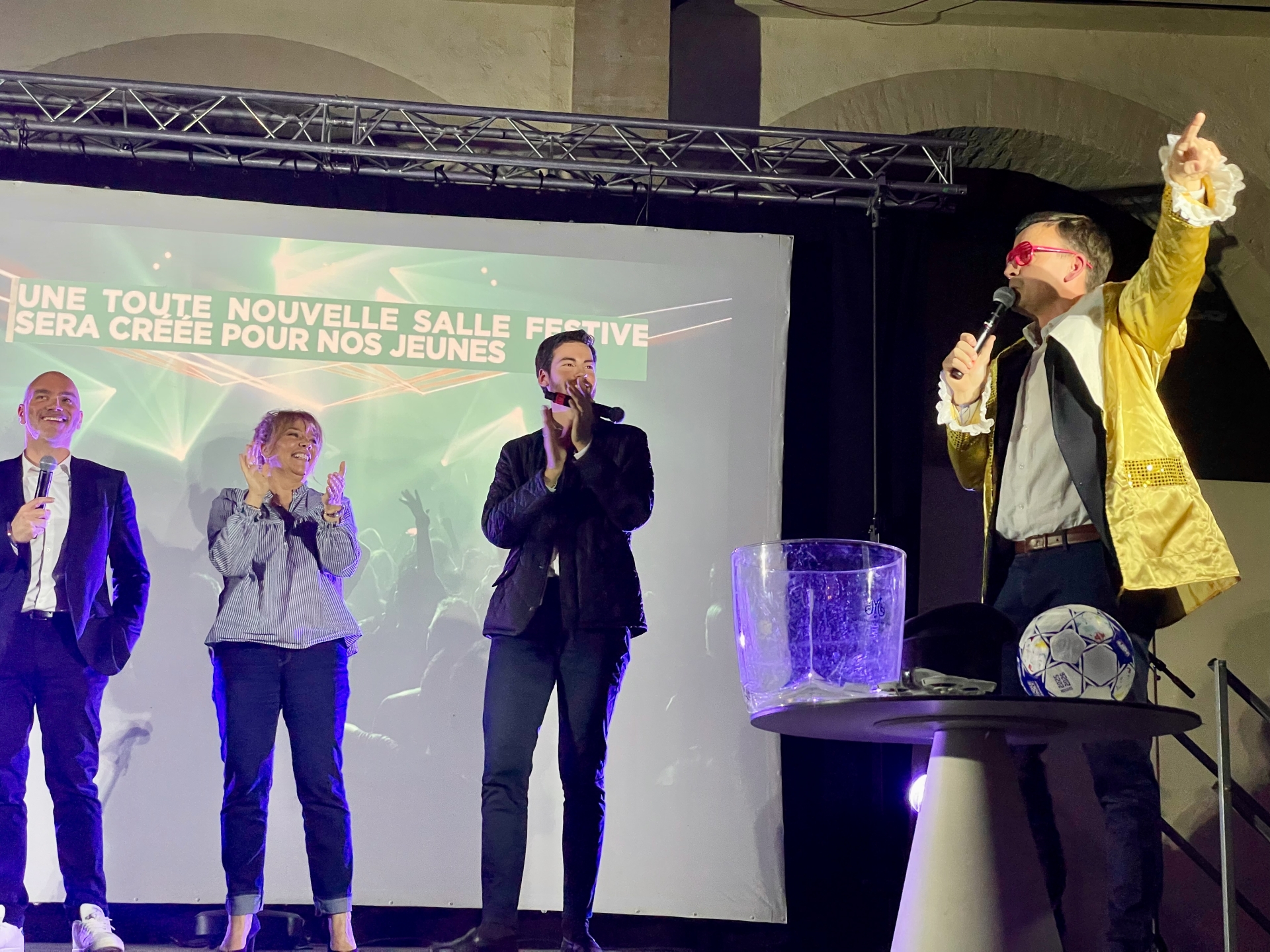 Lors de l’évocation de la création envisagée d’une nouvelle discothèque, qui serait exploitée par un opérateur privé, l’animateur n’a pas hésité à enfiler un blazer à paillettes jaune et des lunettes roses, apportant une touche plus légère à la réunion.