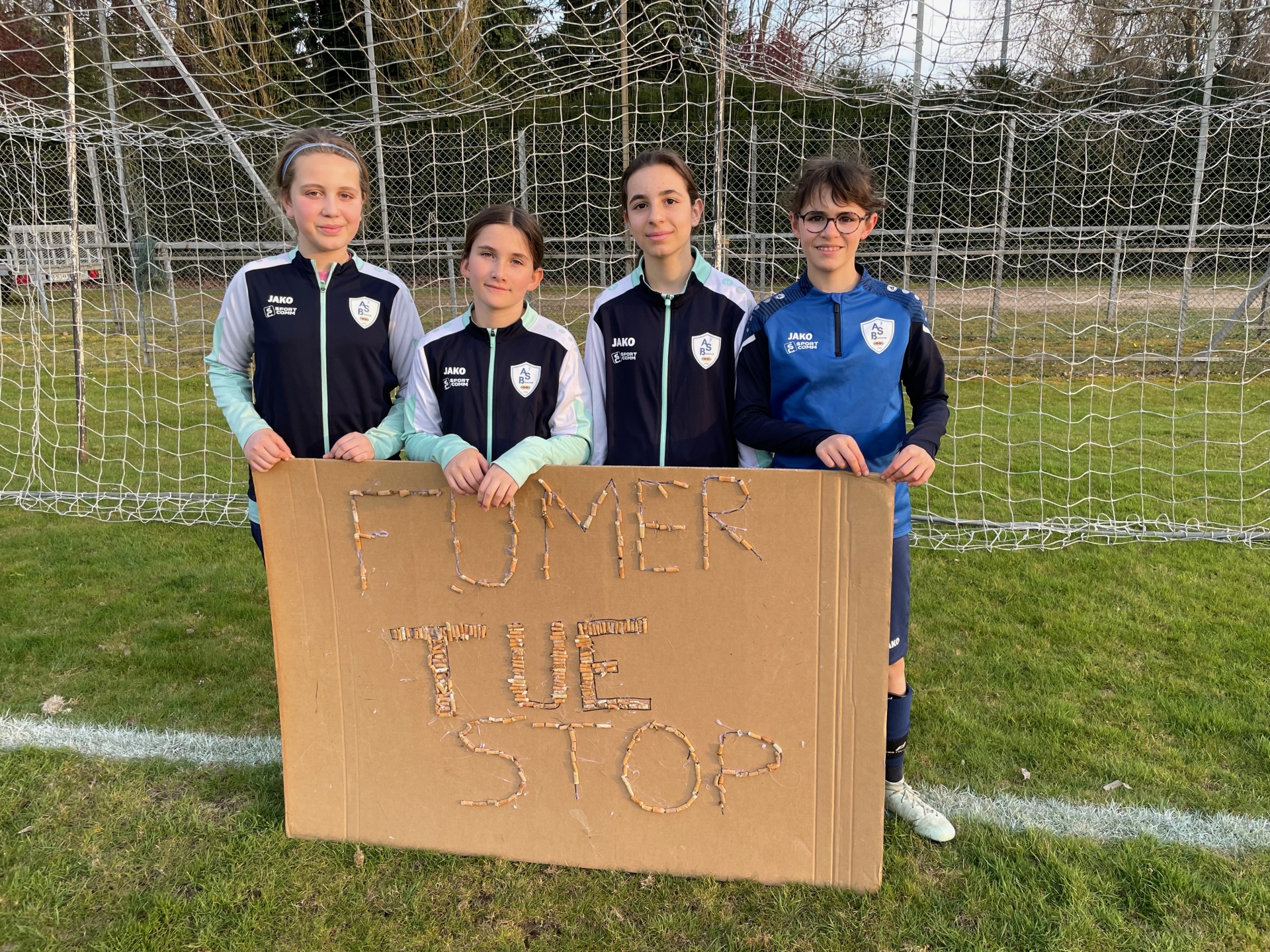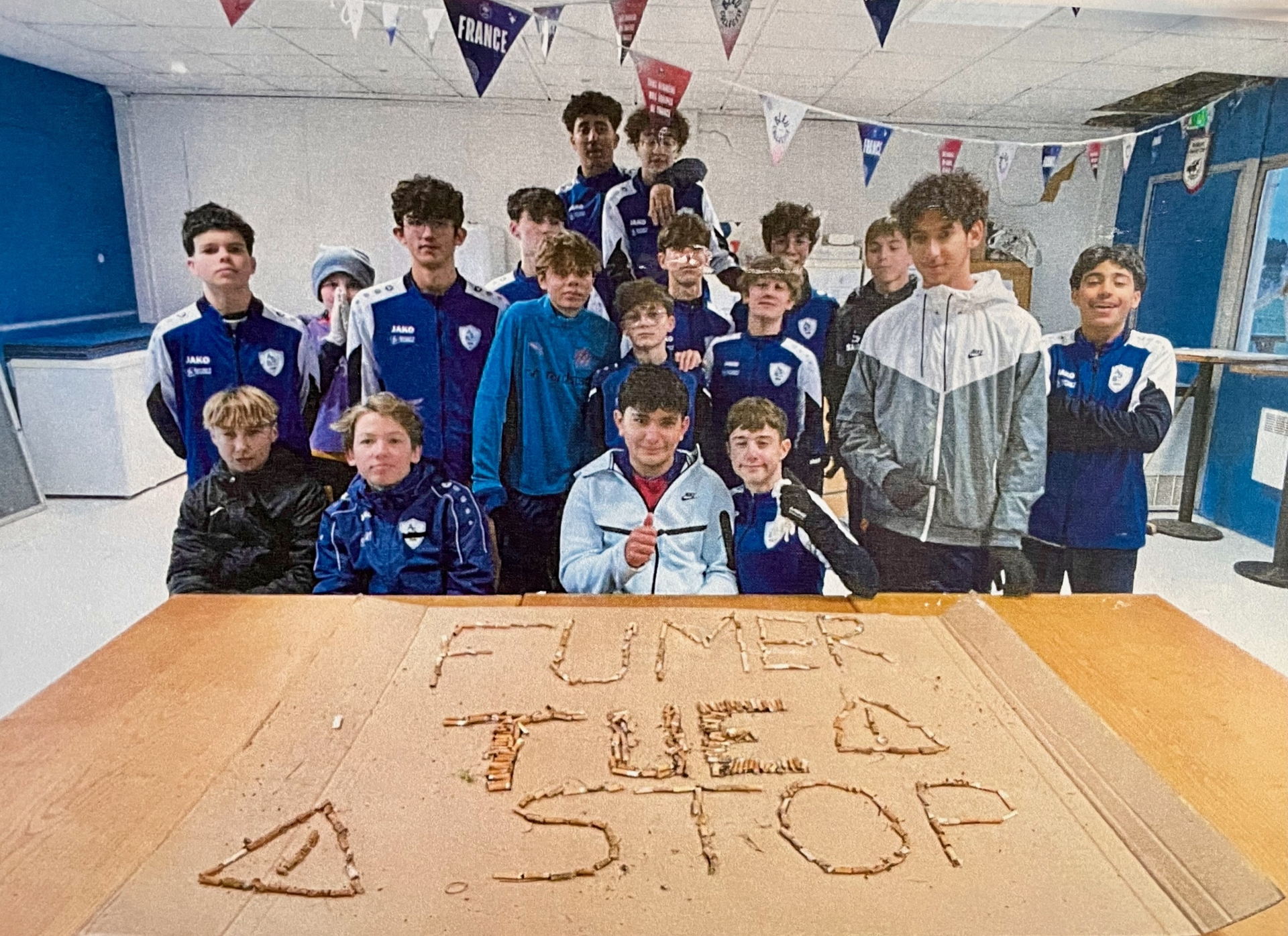 Sur le terrain du stade, près de 400 mégots ont ainsi été collectés par les U15, permettant la réalisation d’une pancarte symbolique « Fumer tue – Stop ».