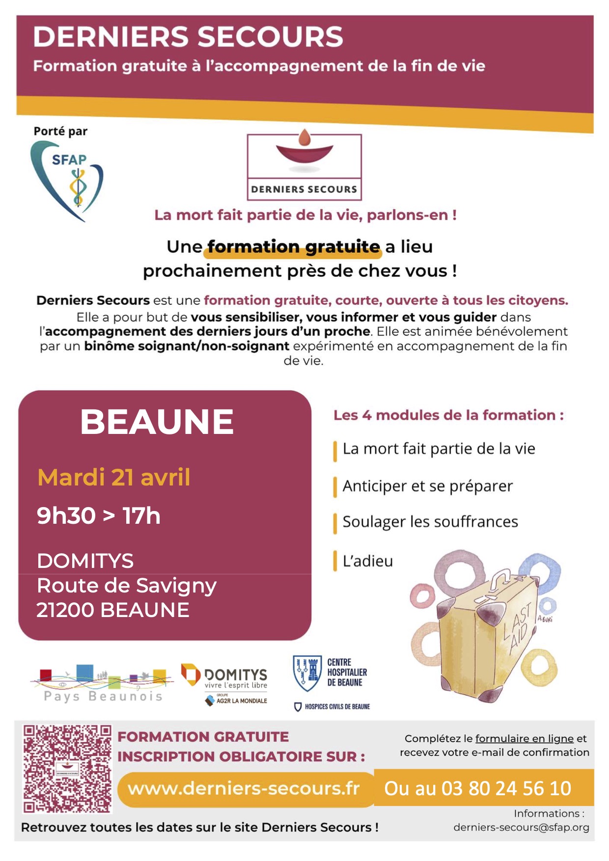 Dans le cadre du Contrat Local de Santé, le Pays Beaunois, l’Equipe Mobile de Soins Palliatifs des Hospices Civils de Beaune et la SFAP (Société Française d’Accompagnement et de Soins Palliatifs) organisent une journée de sensibilisation « Dernier Secours » le mardi 21 avril de 9 h 30 à 17 h à Beaune (Résidence Domitys, route de Savigny).