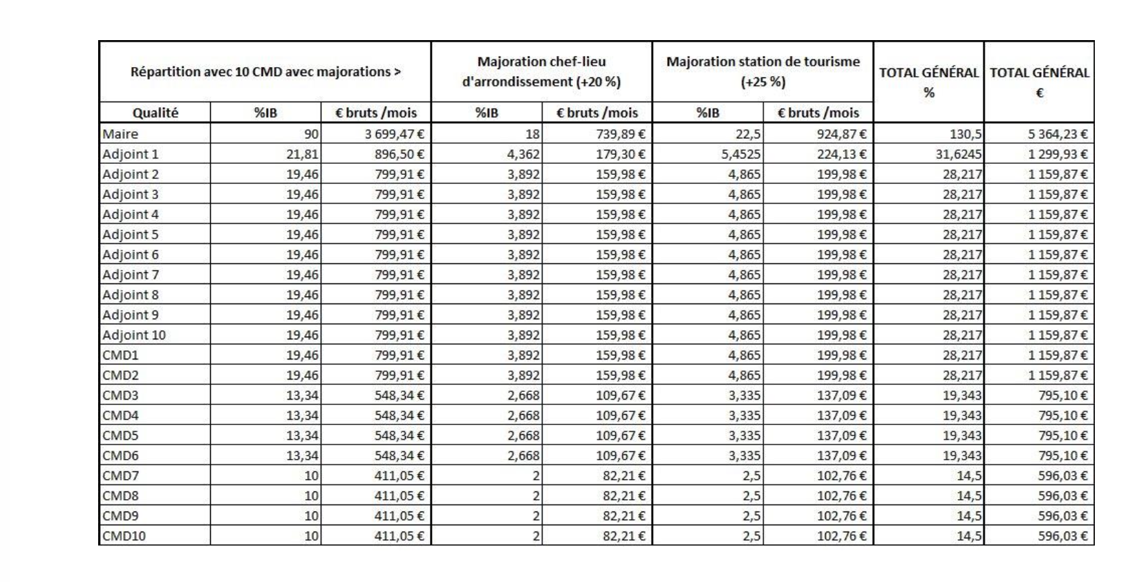 Enfin, le conseil a adopté le principe des majorations, possibles pour une commune comme Beaune, à la fois chef-lieu d’arrondissement (+20 %) et station de tourisme (+25 %). Après application, l’indemnité du maire atteint environ 5 364 € bruts mensuels, tandis que celles des adjoints oscillent entre 1 160 € et 1 300 €, et celles des conseillers délégués entre 596 € et 1 160 €.