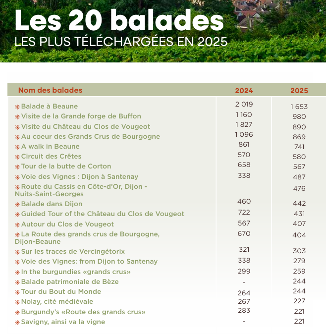 Au niveau régional, l’application recense les 20 balades les plus populaires, mêlant classiques bourguignons et itinéraires originaux. Pour le Pays Beaunois, la balade n°1 plébiscitée depuis des années reste celle de Beaune et celle de Savigny figure déjà parmi les parcours les plus appréciés avec 221 téléchargements en 2025.