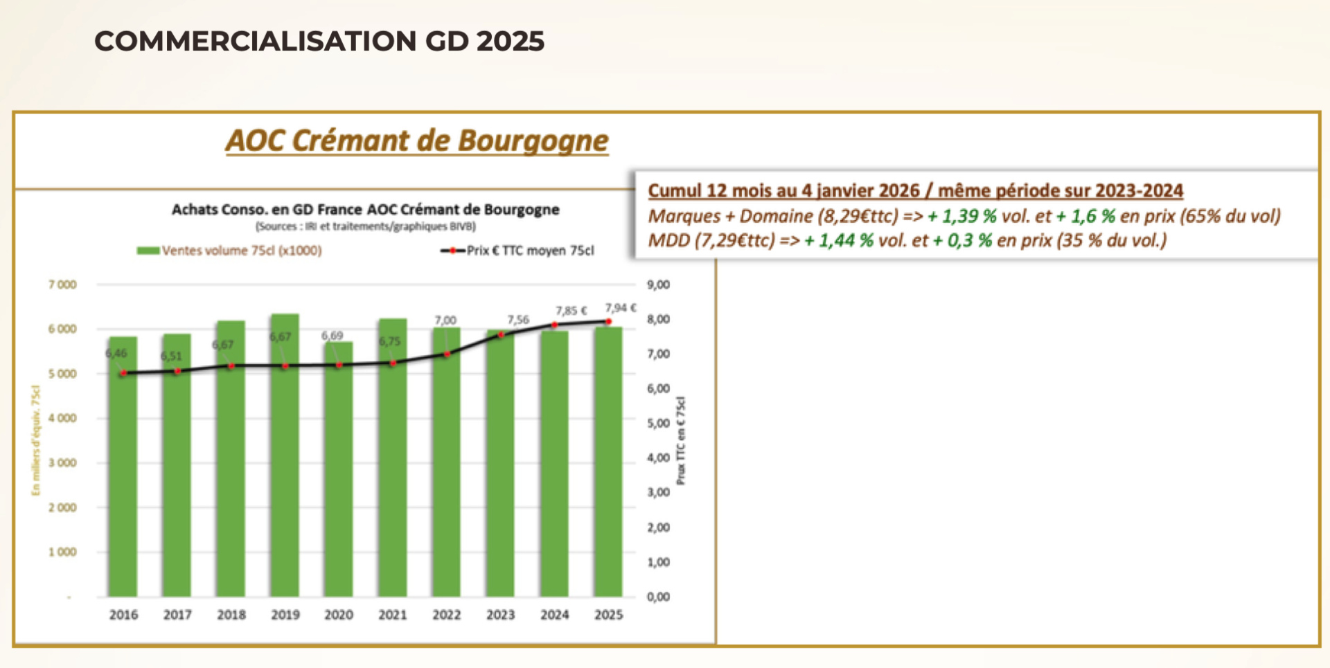 En France, la grande distribution représente 28 % des volumes (environ 6 millions de bouteilles, +1,4% en volume d’achat) pour l’AOC Crémant de Bourgogne. Positionné autour de 8 € en moyenne, le Crémant de Bourgogne : se situe environ 1 € au-dessus de ses principaux concurrents, affirme une identité propre en linéaire et séduit par la qualité de ses vins tout en proposant des prix attractifs.