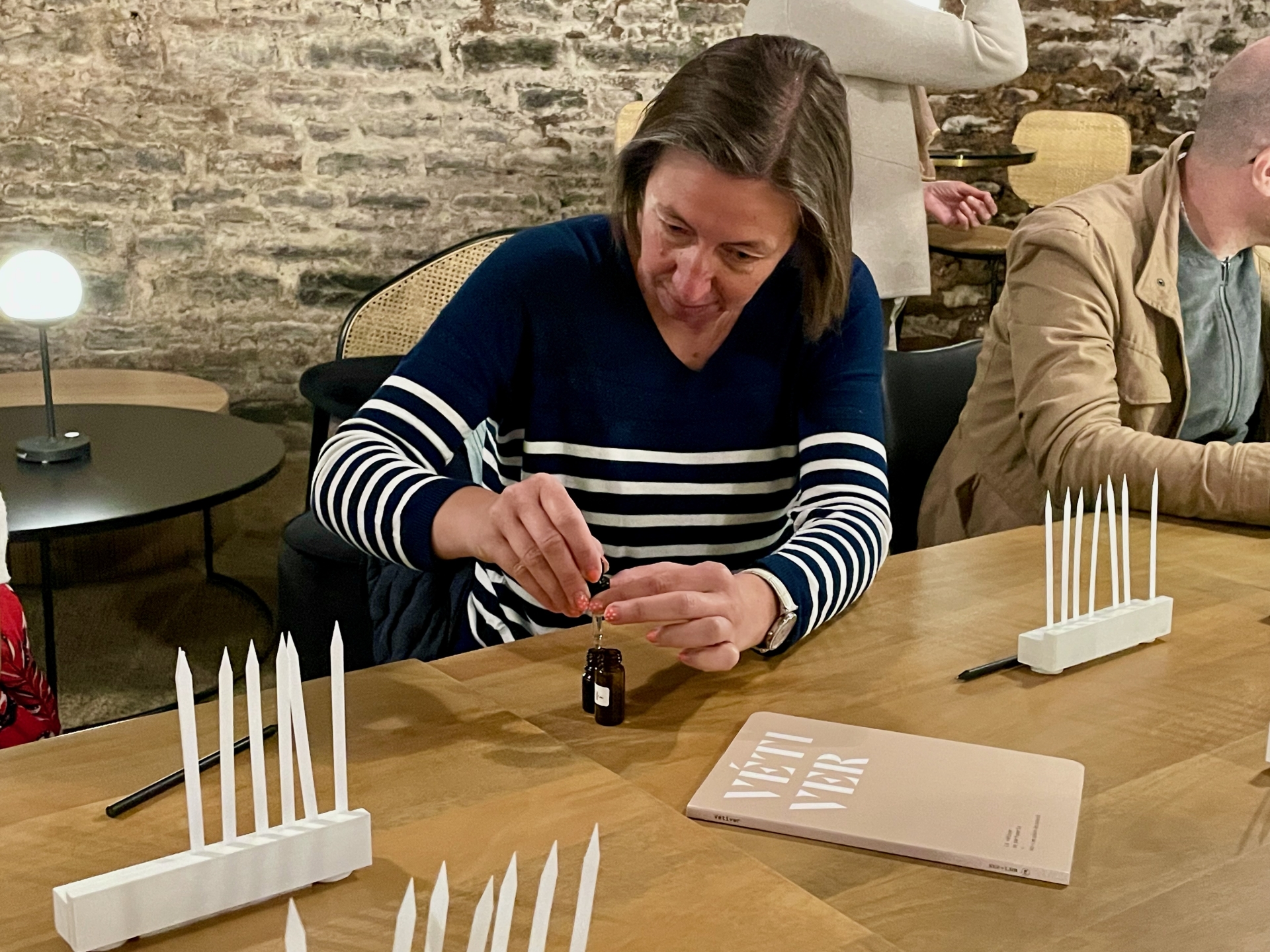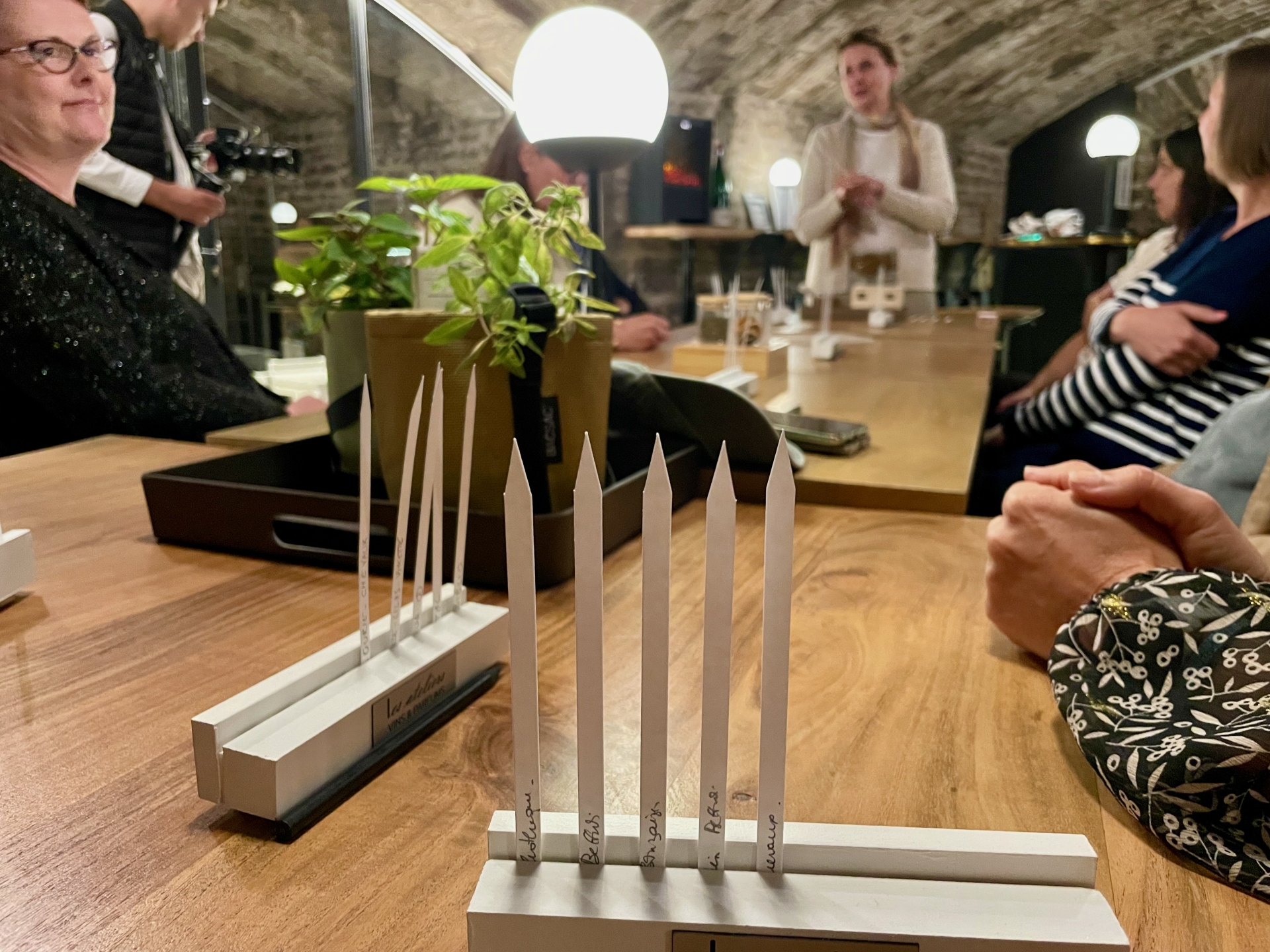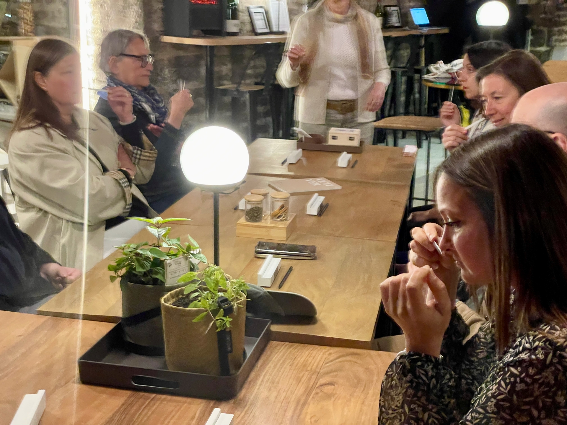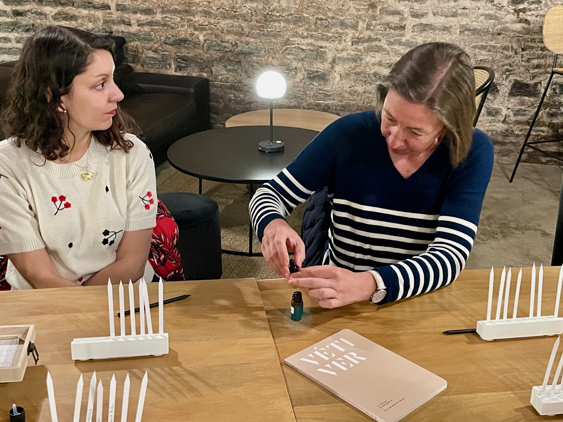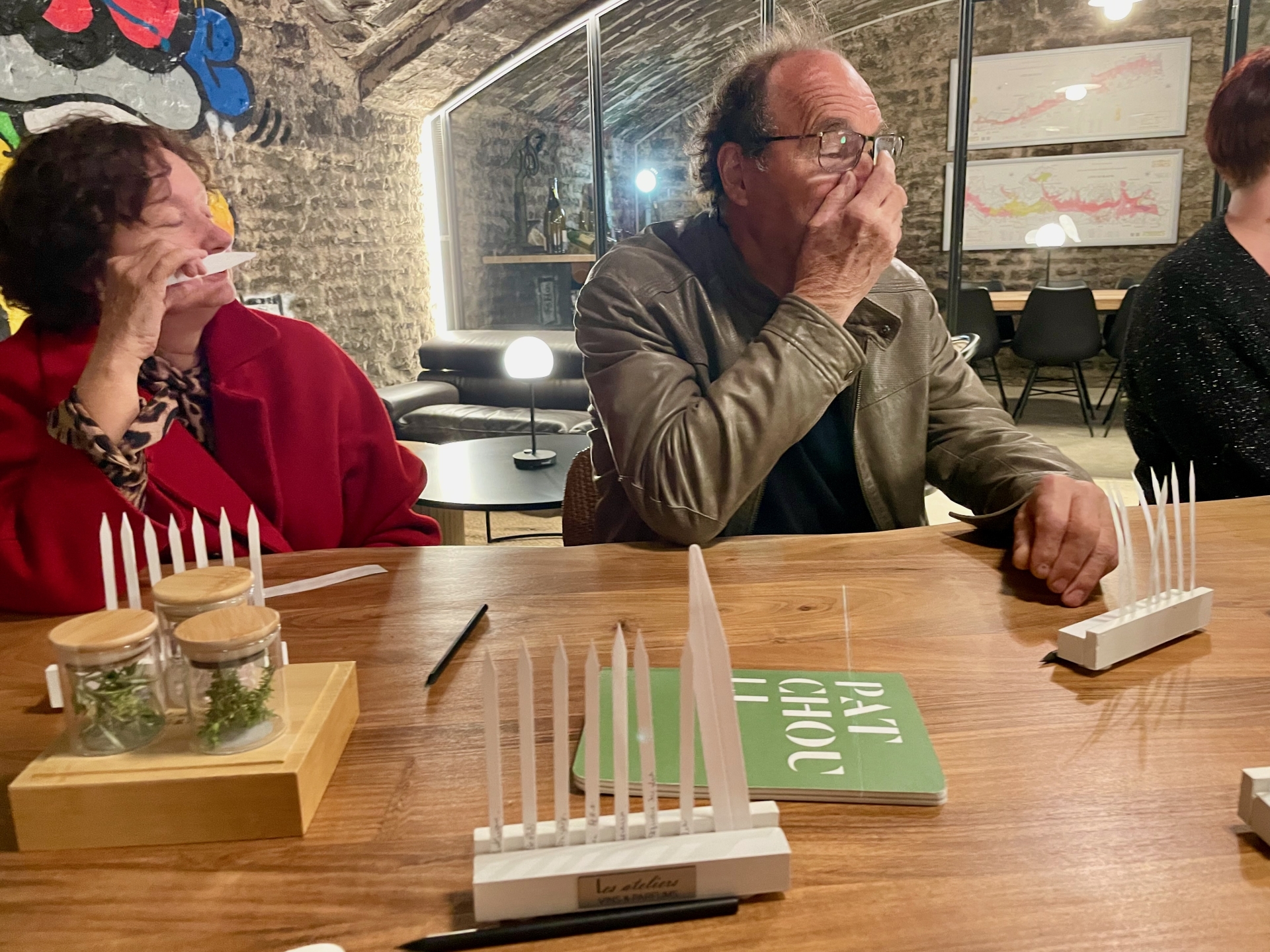 À l’issue de la balade, les participants rejoignent un lieu partenaire – comme l’Hôtel Solstice, ancienne distillerie – pour un atelier animé par Marie-France Bravard. Originaire de Beaune et formée notamment à Grasse puis dans les grandes marques de parfum, elle propose une initiation à la parfumerie inspirée du parcours effectué. « L’idée est de prolonger la visite en sollicitant la mémoire olfactive des lieux emblématiques visités », explique-t-elle. Six accords sont présentés aux participants, - six lectures personnelles à Marie-France selon son ressenti des différents depuis son enfance -, chacun correspondant à une ambiance ou un lieu traversé : notes aromatiques (plantes, jardins), accords aquatiques (la rivière), notes florales, touches boisées, accords cuirés ou encore notes plus abstraites, métalliques ou épicées…