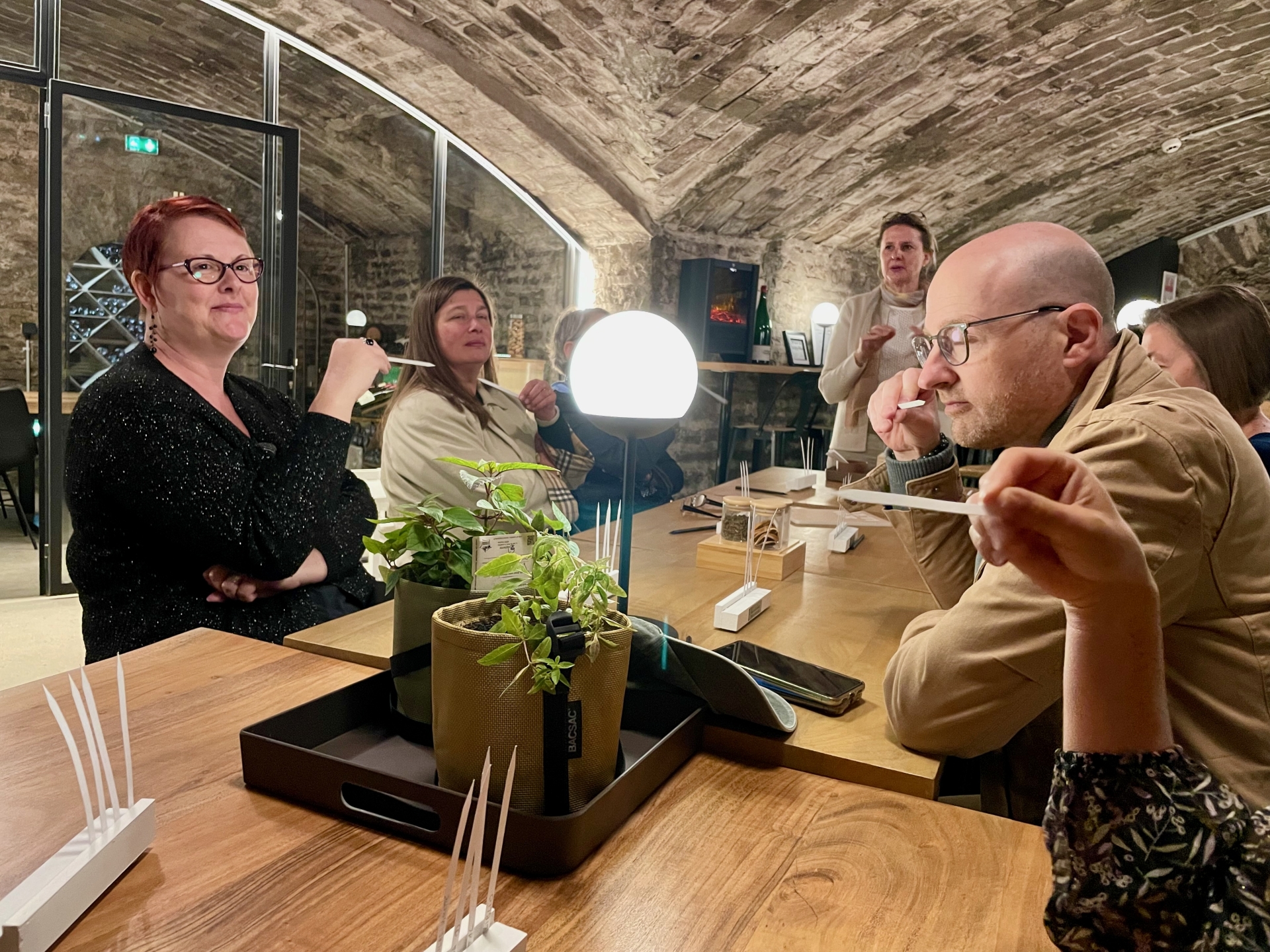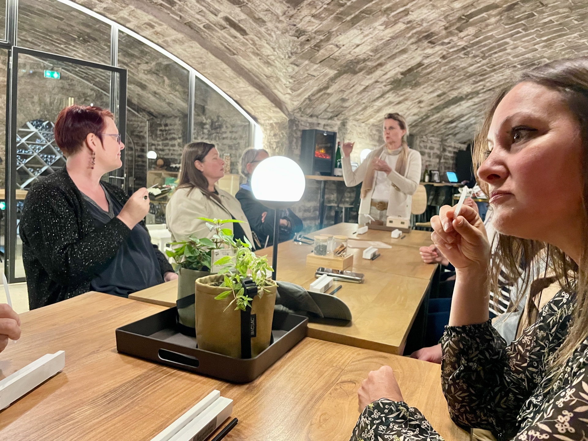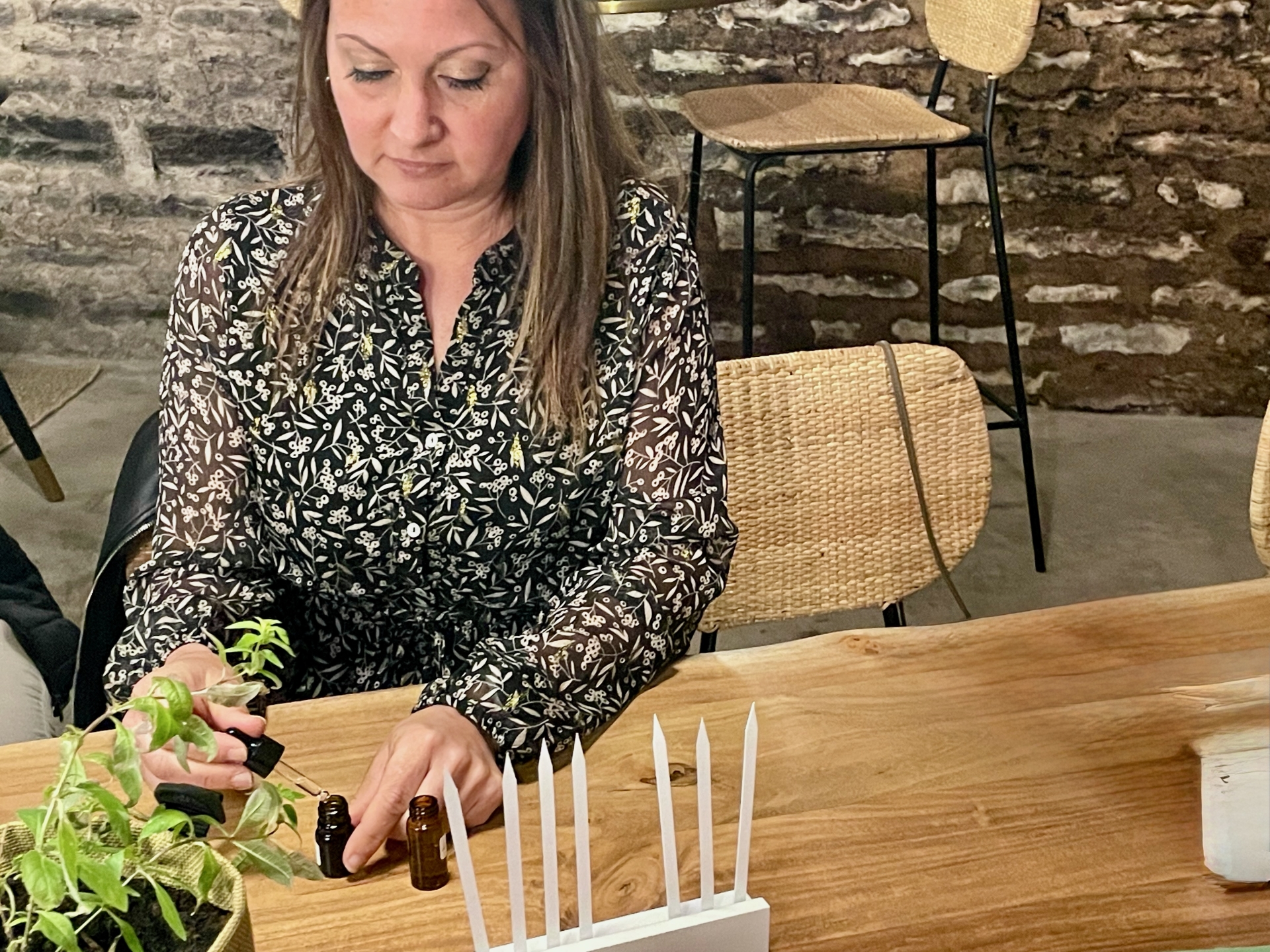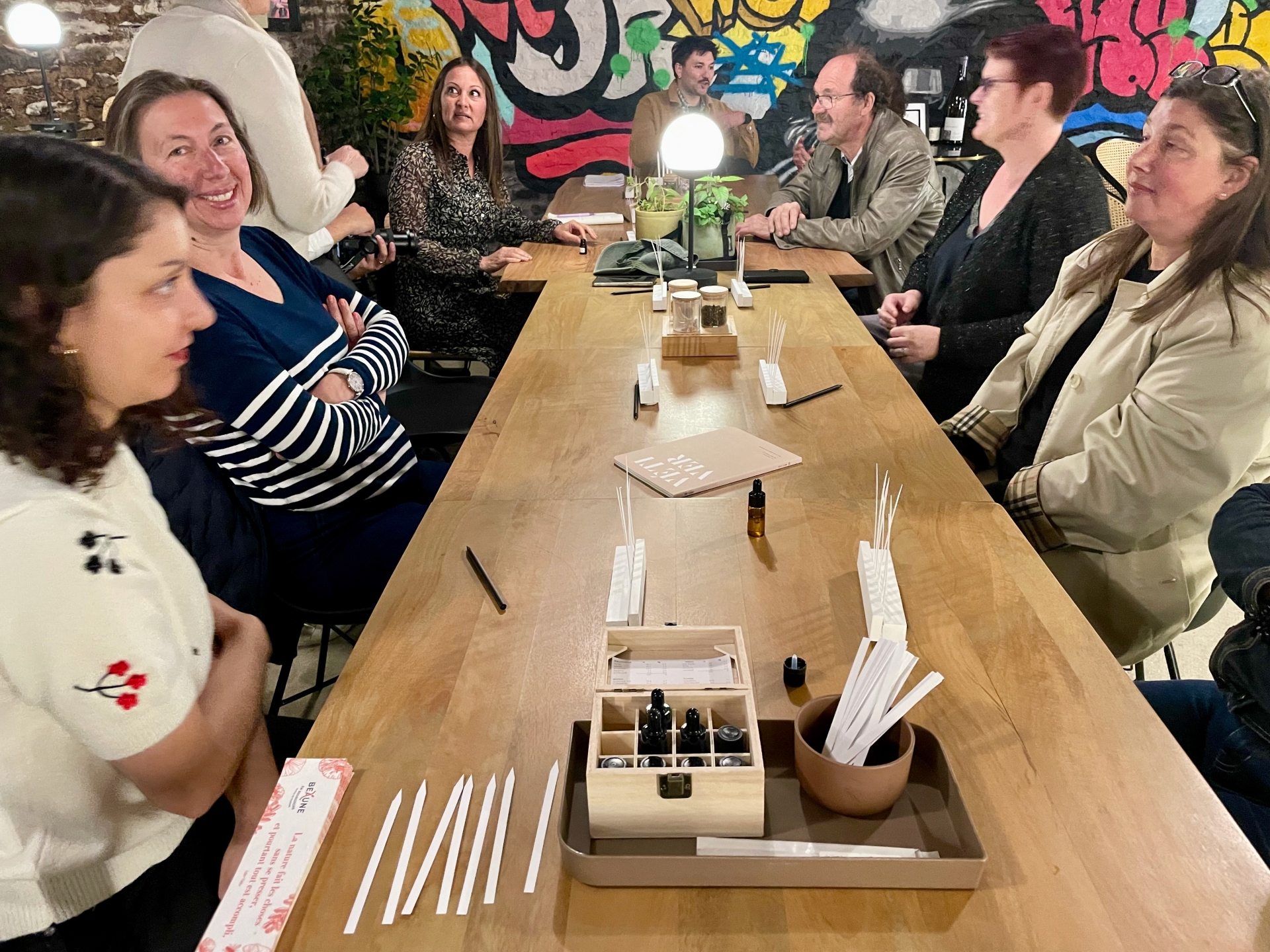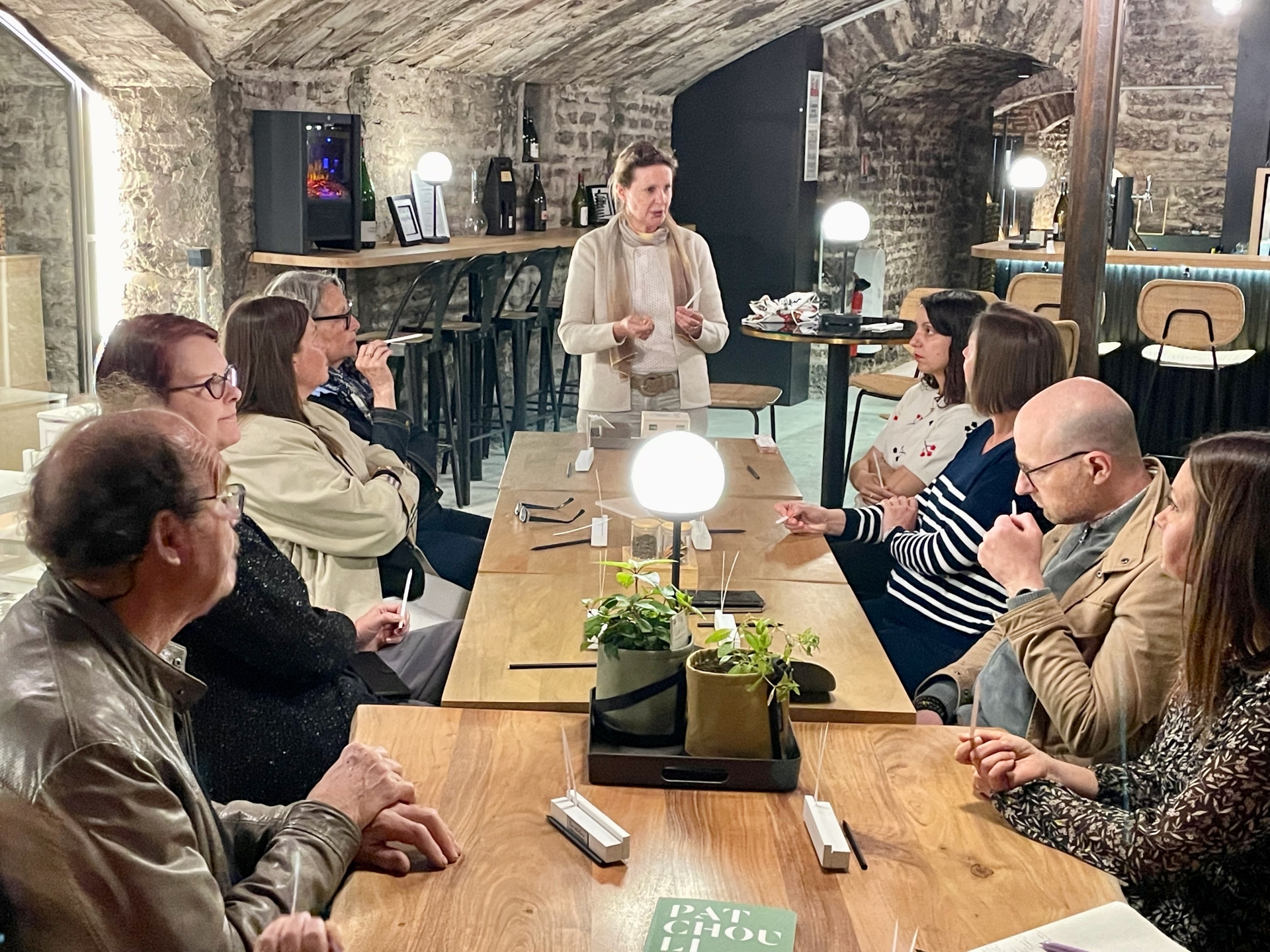 À l’issue de la balade, les participants rejoignent un lieu partenaire – comme l’Hôtel Solstice, ancienne distillerie – pour un atelier animé par Marie-France Bravard. Originaire de Beaune et formée notamment à Grasse puis dans les grandes marques de parfum, elle propose une initiation à la parfumerie inspirée du parcours effectué. « L’idée est de prolonger la visite en sollicitant la mémoire olfactive des lieux emblématiques visités », explique-t-elle. Six accords sont présentés aux participants, - six lectures personnelles à Marie-France selon son ressenti des différents depuis son enfance -, chacun correspondant à une ambiance ou un lieu traversé : notes aromatiques (plantes, jardins), accords aquatiques (la rivière), notes florales, touches boisées, accords cuirés ou encore notes plus abstraites, métalliques ou épicées…