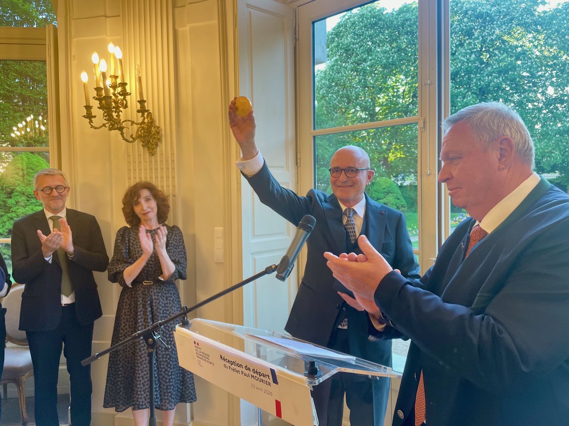 Même tonalité du côté de François Sauvadet qui a livré un hommage particulièrement appuyé. « Vous resterez dans l’histoire du département », a déclaré le président du Département. Il a notamment évoqué « le sang-froid » et « la qualité du dialogue » du préfet lors des crises traversées ces derniers mois, notamment après le drame du collège incendié. Il a également salué sa capacité à gérer des dossiers sensibles liés à l’eau et aux tensions agricoles. « Vous avez réussi à faire un grand pas pour la sécurisation de l’eau avec une méthode exemplaire et toute l’implication des services. » Avant d’ajouter : « Vous avez eu un parcours remarquable, exemplaire, que je souhaite à tous les fonctionnaires. Vos actions auront profondément marqué le territoire ». Moment symbolique de la soirée : François Sauvadet a remis à Paul Mourier la médaille d’honneur du Département de la Côte-d’Or.