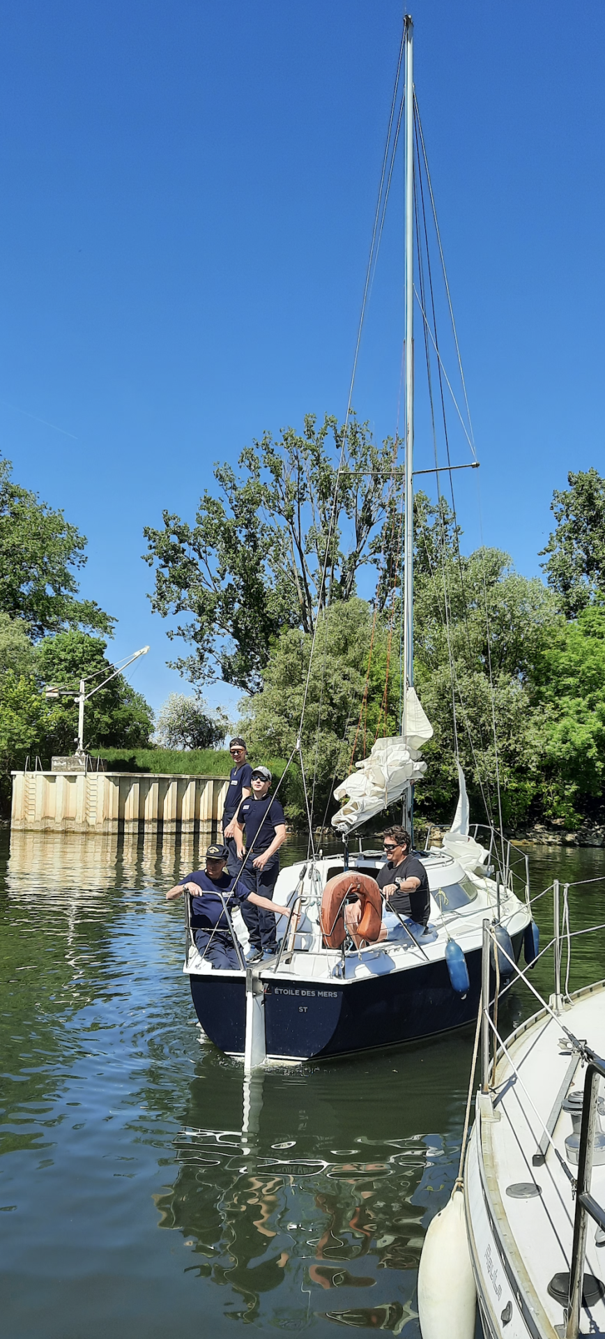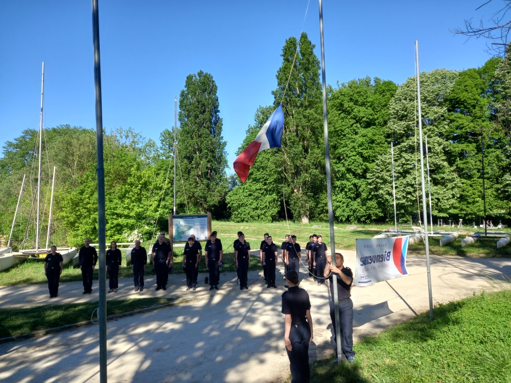 La Marseillaise a résonné ce samedi 25 avril matin, chantée a capella par les 21 jeunes et les 6 cadres de la Préparation Militaire Marine de Beaune, venus s’initier à la navigation au Yacht Club de Chalon-sur-Saône. La montée des couleurs sur le mât de pavillon a marqué le début d’une journée riche d’enseignement et de partage entre les stagiaires marine, les adhérents bénévoles du Yacht-Club et leur moniteur de voile Edern.