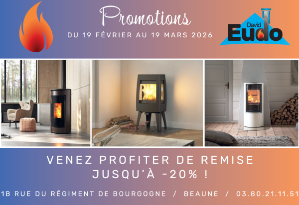 Jusqu’à 20% de remise chez David EUDO votre spécialiste de poêles à bois, granulés et cheminées