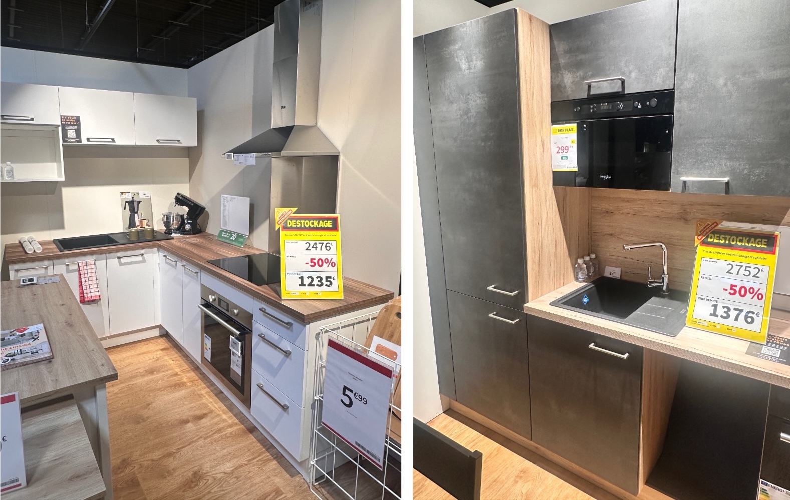 Profitez également d’une offre exceptionnelle sur nos cuisines d’exposition, proposées à -50%. Entièrement équipées et prêtes à être installées, elles représentent une occasion rare d’acquérir une cuisine de qualité à moitié prix (-50% sur les meubles hors électroménager).